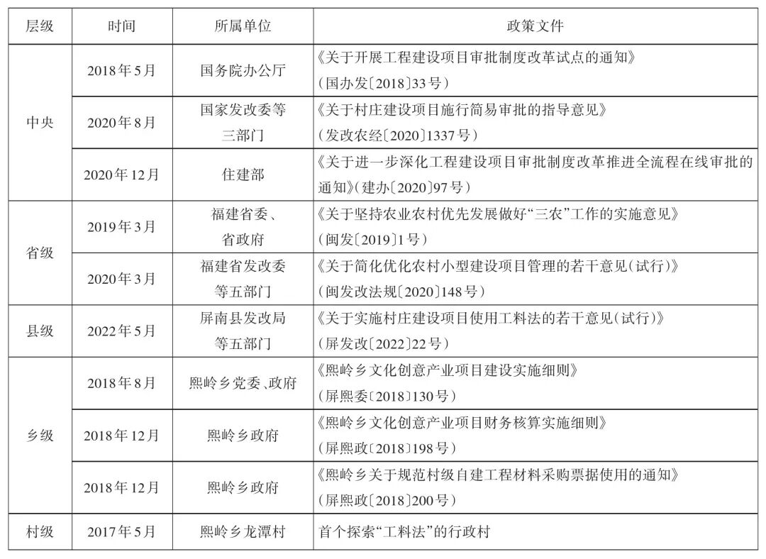 面对历史性考验,2016年8月30日,屏南县出台了《屏南县促进文化创意产业发展的实施意见》等指导性文件。2017年5月,屏南县成立传统村落文创产业项目指挥部,每年安排专项财政预算资金1000万元,用于发展文创产业。在该政策背景下,作为试点村的龙潭村引进了林正碌文化创意团队对整村的古民居进行设计修缮,2017年5月正式动工建设。为了配套对接林正碌团队的创意需求,时任熙岭乡乡长凭借丰富的基层工作经验以及改革创新的魄力,提出适应乡村建设项目的工程管理办法“工料法”的1.0版本即“雇工购料”,主要意涵是使用在地的工人和材料,在管理办法上仅有一份出工单和一份领料单。
