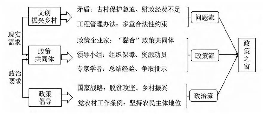 以设立领导小组、形成偏好方案,凝聚偏好同源的政策共同体共识。其一是设立领导小组,地方领导小组是政策共同体成员推动政策议程的有效组织保障,是促进基层试验上升为政策的重要议事协调机构。领导小组通过地方党政领导作为组长的嵌入性身份,能够“高位推动”跨部门的工作任务,突破常规科层组织部门分割的弊端,促成领导层的偏好同源,保障专项任务的实施。“工料法”这一基层试验得益于“县—乡”级地方领导小组的指挥和落实。其二是形成偏好方案,共识的凝聚和偏好的方案二者是一体两面的关系,偏好的方案既是凝聚共识的基础又是凝聚共识的产物。具体到“工料法”,根据问题流中的现实需求和约束,政策共同体的共识是按照“招投标”的方式无法在财政困难、人口外流的约束下启动文创振兴乡村事业,对应的方案是推行与乡村建设相适应的乡村工程管理办法。