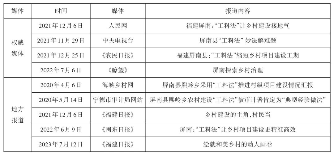 工期短、开支少、能创收是“工料法”区别于“招投标”的政策成效。其一,缩短“招投标”程序的前期耗时。单个项目经过设计、预算、财审、“招投标”等环节,历时在3个月以上,设计和招标各1个月、预算和财审各15天。以熙岭乡为例,采用“工料法”建设了77个村级项目,可节约前期工作时间200个月以上。其二,节省项目开支。可节约30%以上的资金,自2017年5月开始熙岭乡累计以“工料法”完成了77个7545.89万元的投资项目,两大重点投入项目是基础设施建设类和农房修缮类。其三,本地化用工。“工料法”让原本外出务工的村民留了下来,实现了家门口就业。以龙潭村为例,2017年5月至今发放了人工费1769万元,参与投工投劳的村民、工匠达200多人,人均年增收3万元。“工料法”达成的多项成效,使其还获得了人民网、《农民日报》等媒体的报道(如表2)。