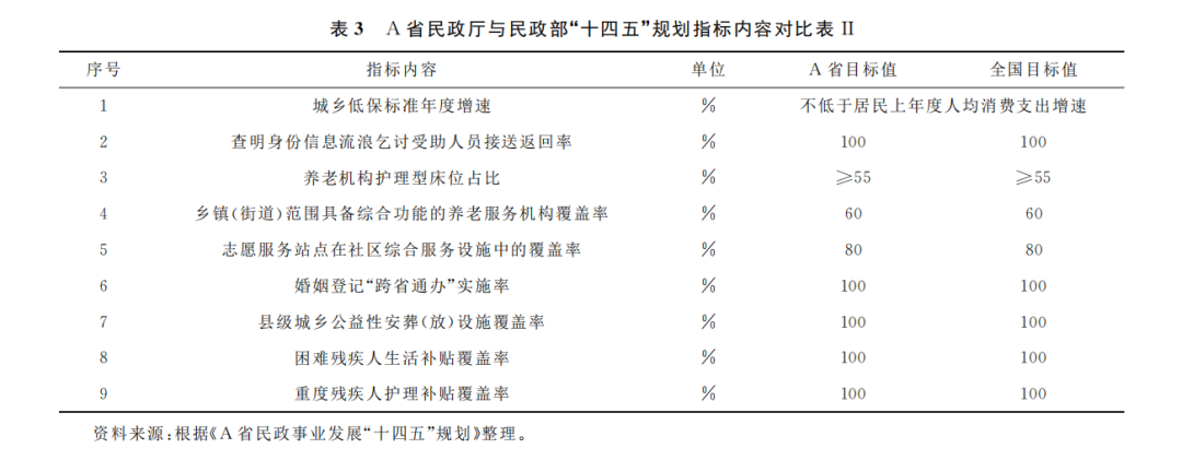 回应类指标。主要特征是:一是被动设立的,即属于上级的规定指标;二是确立的目标值较低,与上级标准持平或更低,这些工作或是地方缺乏基础的,或是各地方的任务标准都统一,以至于地方无法用于显现更优的绩效。在A省印发的指标中,“城乡低保标准年度增速”、“查明身份信息流浪乞讨受助人员接送返回率”等9项指标都属于这一类型,这可以从A省与民政部的指标对比中看出来(见表3):A省的目标值基本上是复制民政部的,除了100%落实的指标外,其余多个指标都没有提出额外的要求。