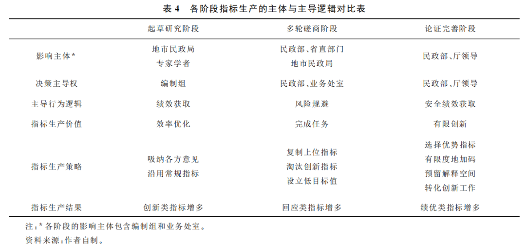 在起草研究阶段,指标的生产是以编制组意见为主导的绩效获取逻辑,使得指标的酝酿更多地向“创新类指标”集中。在多轮磋商阶段,指标的生产转向以业务处室意见为主导的风险规避逻辑,指标生产的态度趋于保守,更多将风险最小化即“完成任务”作为决策出发点,以复制上位指标和设立低目标值的策略替代“创新类指标”的生产。在论证完善阶段,指标的生产转向实现双目标平衡的安全绩效获取逻辑。指标的生产呈现出“有限创新”的特征,这使得兼得高绩效与低风险目标的“绩优类指标”超越“回应类指标”成为主要的指标类型。