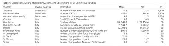 本文的抽样样本由2010年人口在10万及以上、截止2016年6月11日已实施开放数据政策的美国城市组成。在274个符合条件的城市中,有76个城市(占28%)的网站被标记或描述为开放数据平台,对这些网站的分析发现,76个网站中有16个网站需要登录和密码才能访问,筛选出60个城市作为最终的分析样本。使用的数据包括从城市开放数据站点收集的新原始数据和来自美国超过1500个市政部门的数据。前者利用Python编写的软件采集数据,后者主要来自行政文件。