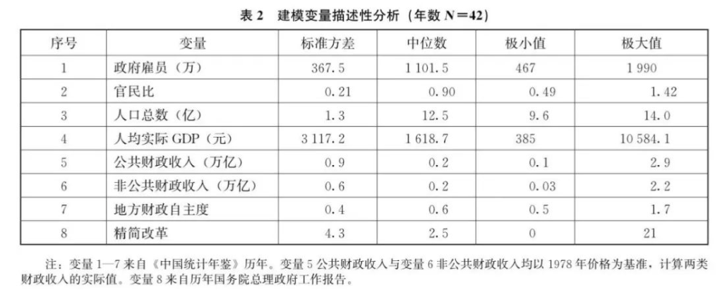 一个国家的政府能够雇用多少人手来打理政治和行政取决于它的财力。财政收入规模之所以必然对政府雇员规模产生影响,说到底,是因为没有前者,后者就是无源之水。美国预算学家克利夫兰认为,控制政府这条船的行为的最好方式就是控制开船所需的燃料。控制政府权力扩张的最好方式是控制资金。不过,在此有必要就反向因果即政府雇员规模变动决定财政收入规模问题略加讨论。考虑到如下事实,我们认为,财政规模增长和政府雇员规模增长的影响关系主要是单向性的,后者对前者的影响不能说完全没有,但是很小,可以忽略。第一,从供给面看,政府财政收入规模受国民经济和收入的制约,政府雇员作为上层建筑的一部分,对国民经济的直接贡献很小,因此不存在政府雇员规模影响经济本体、后者继而影响财政收入规模的因果链条。第二,从需求面看,政府雇员工资福利支出仅占政府财政支出的一部分,公共服务、社会保障、经济基础设施建设和维护、国防外交等构成了政府财政支出的主体。第三,从制度层面看,官员的扩充可能提高科层制的能力,从而提高财政汲取能力,但冗官繁政更可能削弱国家治理的效率,从而损害财政汲取能力。而且,科层制不是国家制度的全部,其他制度如选举制度、政党制度、税收制度、政府间关系制度等可能对政府雇员和财政收入规模产生这样或那样的影响。第四,如上所述,政府雇员中无编雇员占相当大的比重。无编雇员终究也需要财力支持。编制雇员和公共财政拨款绑定,而非编人员则自然得多依靠来自非公共财政收入的支出。这正是本文引入公共财政收入和非公共财政收入两个变量建模的意义所在。与使用人均实际GDP的思路相同,为了排除通货膨胀的影响,我们以1978年价格为基准,计算了两类财政收入的实际值。我们还在稳健性检验中使用了两类财政收入占GDP的比重,进一步控制了财政收入随着经济发展而增加的趋势。
