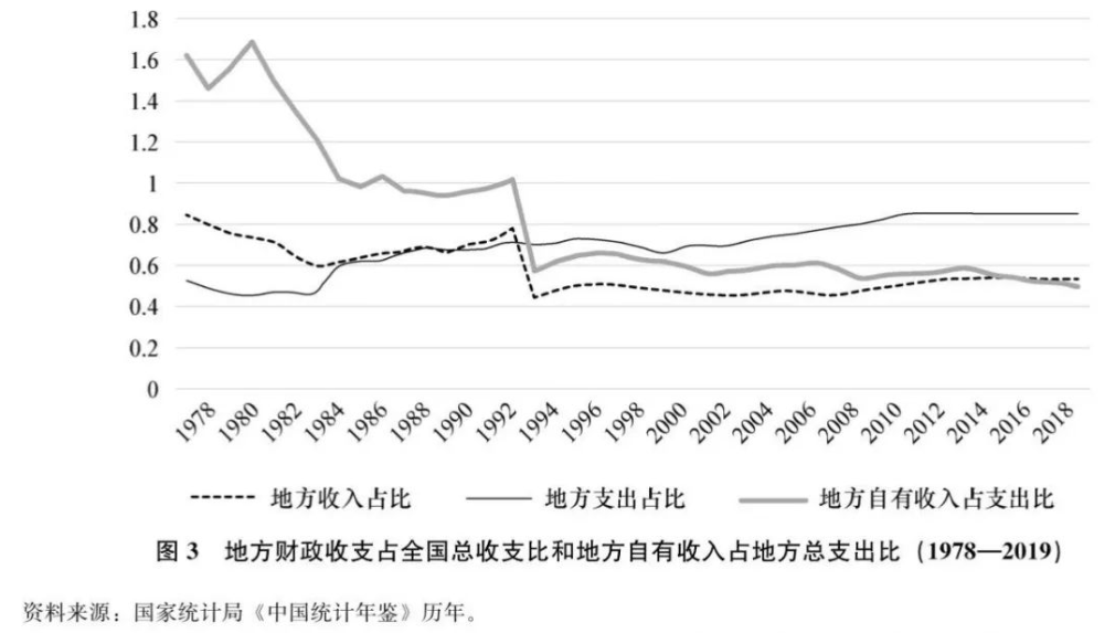 本文测量财政分权所采用的指标——地方自有收入占支出比重,在分税制下,理论上可因如下三个因素的变动而变动。其一,通过改变中央与地方收入划分规则:1994年税种划分、共享税增值税分享比例划分;2002年所得税分享比例重划;“营改增”从地区和部门试点运行到全面铺开,这些改革基本都有利于中央财政收入集权。如图3所示,1994年分税制首次全面实施,地方自有收入占支出比从上一年的1.01骤然至0.57。此后,收入划分规则改变产生的影响转为微调性质,如在所得税分享比例改变的2002年,这一变量从上年的0.59降至0.56;营改增全面实施的2016年,该比例为0.54,显著低于2014年的0.59,也低于2015年的0.55。