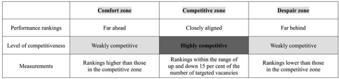 另一方面,在给定的竞争格局下,个人层面的“相对竞争优势”对能否成功晋升更为关键,应该更能影响其投入行为。本文基于现有设计进行改进,将个人竞争优势划分为三类区域:(1)低度竞争的“无忧区”,(2)低度竞争的“无望区”,(3)高度竞争的“竞争区”。至于三个区域的划分方式,作者根据领导既有形势,就上届本省市委书记晋升为省委常委的名额作为“预期晋升名额”,将而将政绩排名在“预期晋升名额”数量上下15%范围内活动的划为“竞争区”,排名在其之前即为“无忧区”,之后者为“无望区”。伴随着三个区域的明确划分,作者提出第二个研究假说: