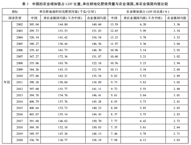 然而,与全球农业强国、其他准农业强国相比,中国劳均农业增加值、劳均农业出口值、农业增加值占GDP的比重、亩均化肥使用量4个指标得分不够理想,拉低了中国农业竞争力绩效的全球排名。如图4所示,无论是劳均农业增加值还是劳均农业出口值,中国的指标不仅与农业强国的均值有很大差距,还与其他14个准农业强国的均值有明显差距。而中国的两个负向指标——农业增加值占GDP的比重和单位耕地面积的化肥使用量,则远高于农业强国和其他准农业强国的均值(如表3所示)。上述指标严重影响了中国农业竞争力以及全球农业强国排名。